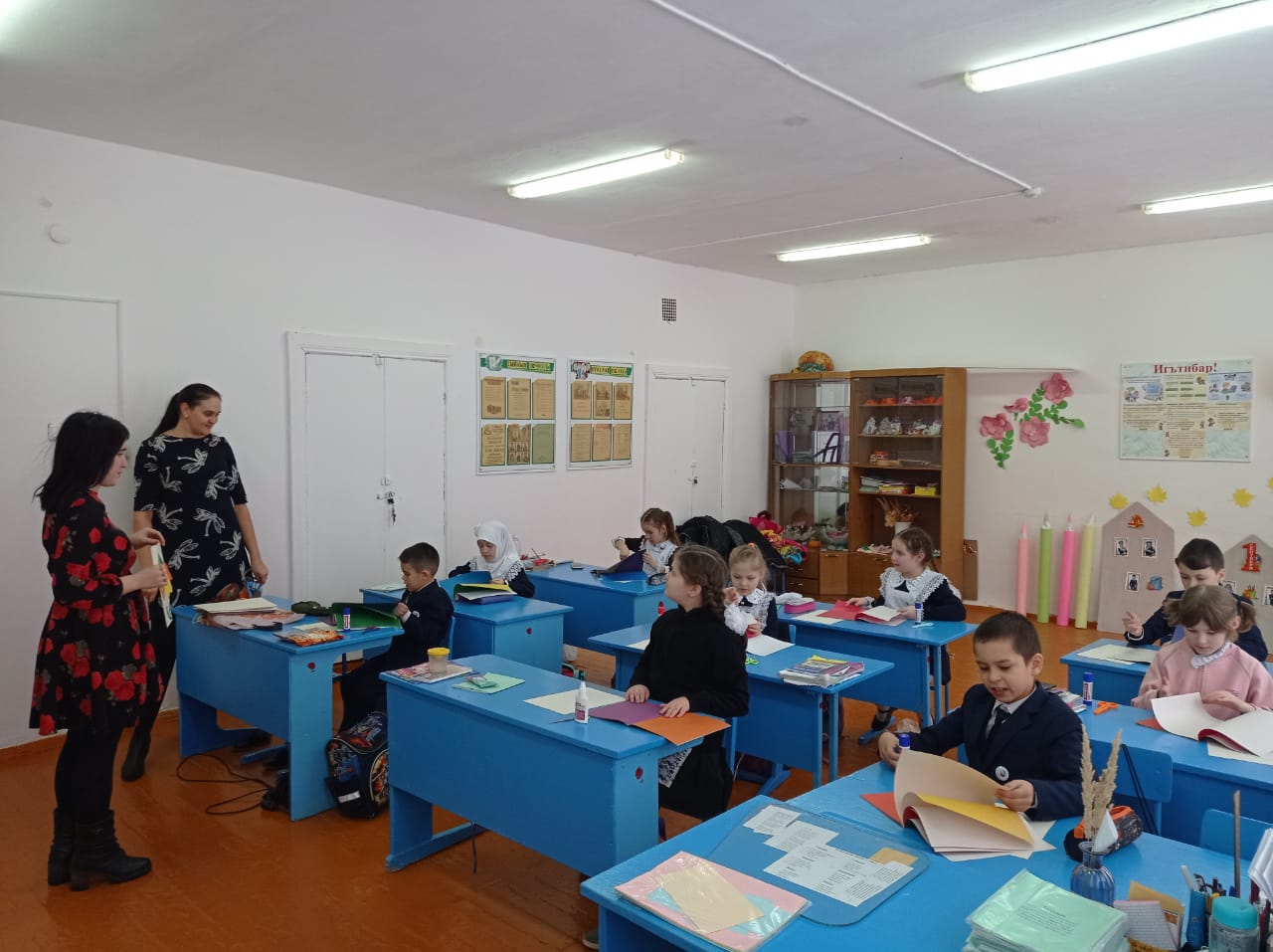 Специалисты реабилитационного центра "Тылсым" провели в инклюзивном классе урок аппликации "Подарок маме".