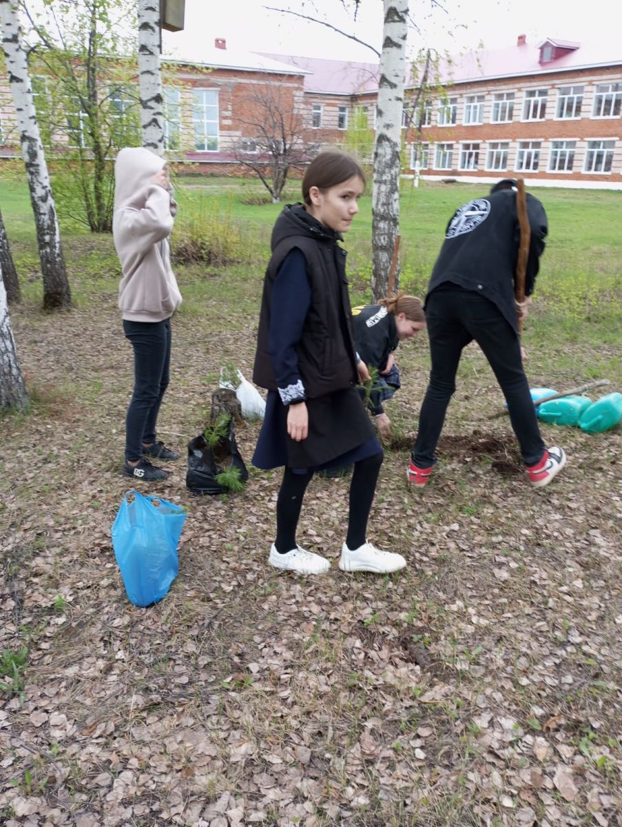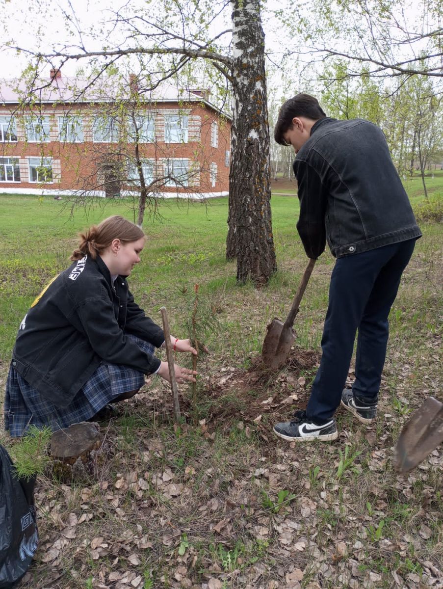 8нче сыйныф укучылары белән мәктәп территориясенә каен, чыршы, нарат агачлары утыртылды.