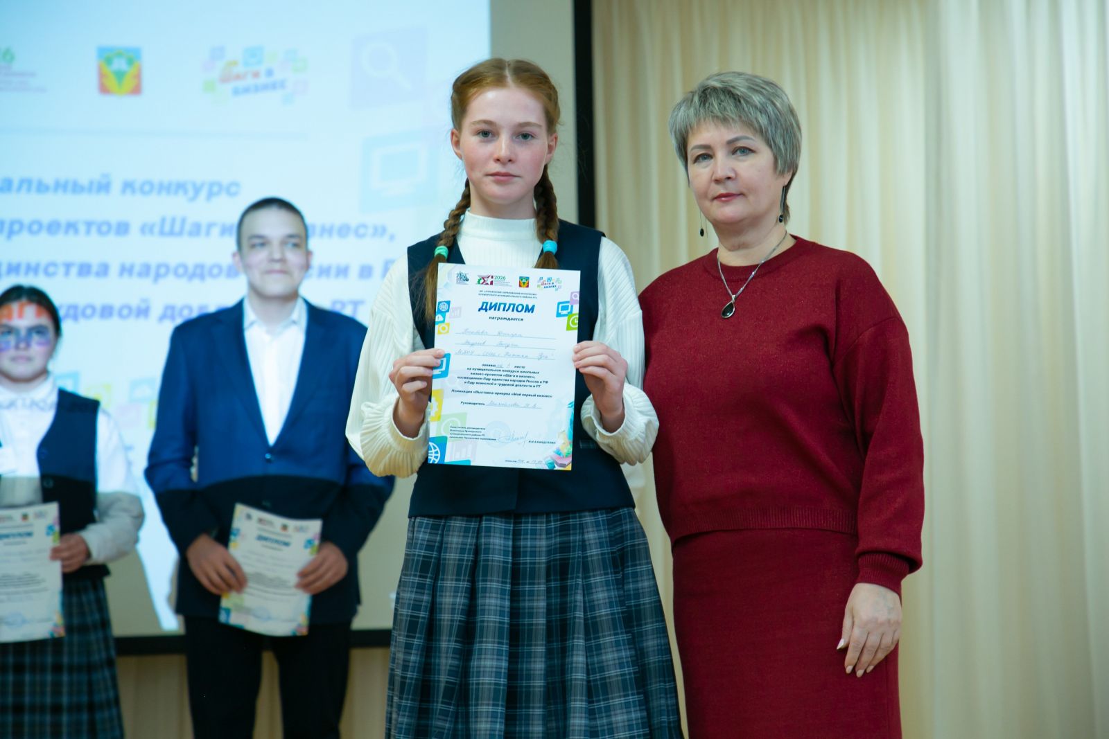 13 март көнне безнең мәктәп укучылары Россия Федерациясендә Россия халыкларының бердәмлеге елына һәм Татарстан Республикасында хәрби һәм хезмәт батырлыгы елына багышланган «Бизнеска адымнар» мәктәп бизнес – проектлары муниципаль конкурсында катнаштылар. Конкурсның максаты-балалар һәм яшьләр арасында эшкуарлык инициативасын гамәлгә ашыру өчен шартлар тудыру, конкурентлыкка сәләтле шәхесне, лидерлык сыйфатларын, социаль җаваплылыкны үстерү.