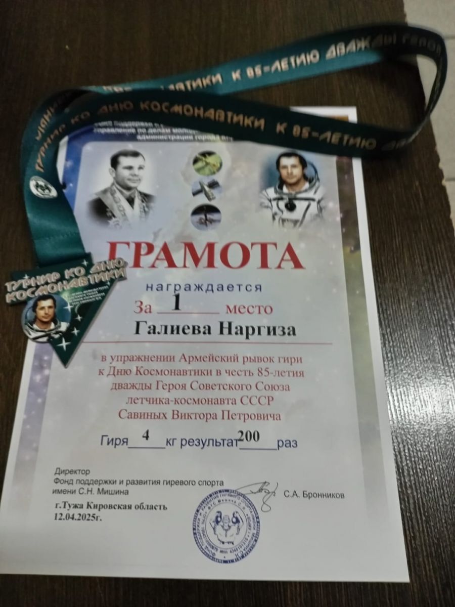 Опубликовано: 14.04.2025При поддержке Фонда поддержки и развития гиревого спорта имени С.Н.Мишина, Управления по делам молодежи, физической культуры и спорта администрации города Кирово-Чепецка в 12 апреля 2025 года г.Тужа Кировской области прошли соревнования по гиревому спорту. В упражнении Армейский рывок гири к Дню Космонавтики в честь 85-летия дважды Героя Советского Союза летчика-космонавта СССР Савиных Виктора Петровича. Ученица 1 класса филиала с.Каенсар Галиева Наргиза заняла 1 место (гиря 4 кг. результат 200 раз). Поздравляем Наргизу и желаем ей дальнейших успехов.
