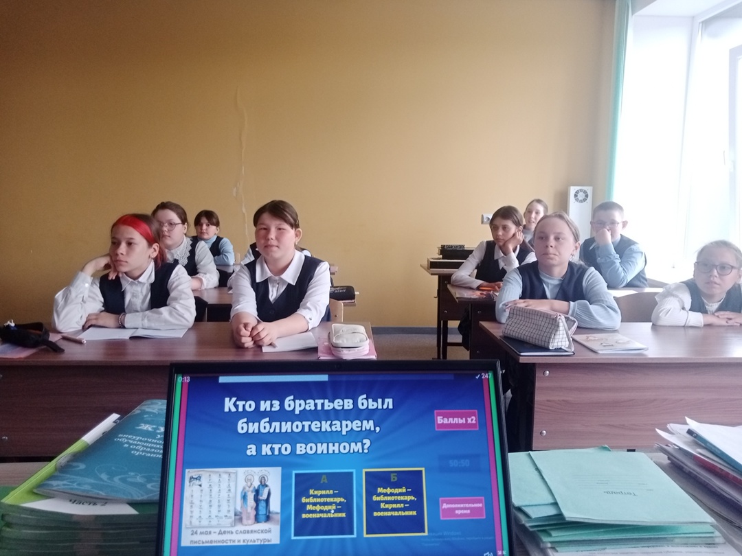Опубликовано: 22.05.2025В преддверии Дня Славянской письменности и культуры в нашей школе прошел познавательный час «День славянской письменности и культуры». Советник директора по воспитанию Иванова О. А. рассказала, что день славянской письменности и культуры отмечается в память двух просветителей - Кирилла и Мефодия. Учащиеся 4Б класса узнали о празднике, его истории и значении для культуры России, о развитии славянской письменности с древних времен до наших дней и о главнейшей роли просветителей Кирилла и Мефодия в создании славянской азбуки. После знакомства со славянской письменностью, ребята попробовали написать свои имена используя старославянский алфавит. В конце урока дети испытали себя в онлайн игре "Аз и Бука". Дети с легкостью ответили на все вопросы.