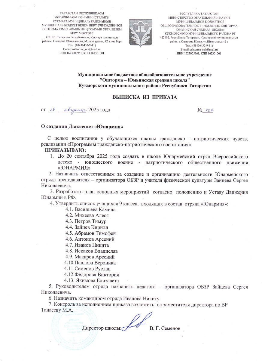 Приказ о создании юнармейского отряда "Патриот"