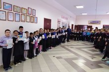 На общешкольной линейке поздравляли победителей III Республиканских научно-исследовательских чтений учащихся, студентов и педагогов имени Габдулхакова Каюмова «Эзлэнүләр аша камиллеккә» Фаляхова А., Тазетдинова Р., НуриевуЭ., Юнысова А.,