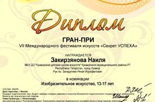 Сәнгать бүлеге укучысы Закирҗанова Наилә "Секрет успеха" халыкара сәнгать фестивалендә катнашып, Гран-При Дипломына лаек булды. (жит.Заһидуллин Р.И.)