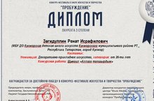 Преподаватель художественного отделения ДШИ Загидуллин Р.И. принял участие в Международном конкурсе-фестивале "Пробуждение", организованный Международным Арт-Центром "Наследие", где завоевал Диплом Лауреата 3 степени. Поздравляем победителя и желаем дальнейших профессиональных побед!