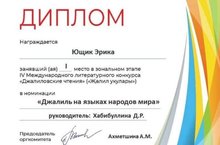 Ющик Эриканы "Җәлил укулары"халыкара конкурсының зона этабында җиңү белән котлыйбыз (Жит. Хабибуллина Д.Р.)