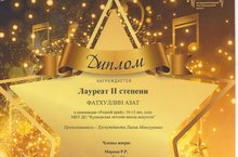 16 мая в городе Казань состоялся Международный конкурс искусств "Талантиада", где в номинации "Вокал- соло" Фатхуллин Азат был удостоен Диплома Лауреата 2 степени, рук. Хуснутдинова Л.М.