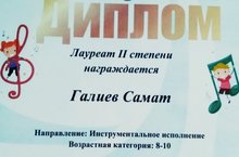Галиев Самат, учащийся музыкального отделения по специальности "Фортепиано" принял участие в Межрегиональном конкурсе "Минута Славы", где завоевал диплом Лаурета 2 степени, рук. Хуснутдинова Л.М.