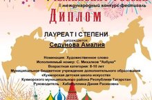 Кукмара балалар сәнгать мәктәбенең театр бүлеге укучысы Седунова Амалия «Россия чемпионаты» Халыкара конкурс - фестивалендә катнашты, анда Хабибуллина Д.Р. җитәкчелегендә 1 дәрәҗә Лауреат Дипломын яулады.