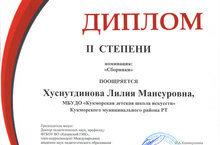 Преподаватель музыкальнорго отделения Кукморской детской школы искусств Хуснутдинова Лилия Мансуровна в номинации "Сборники" Всероссийского конкурса методических разработок педагогов дополнительного образования была удостоена Диплома 2 степени.