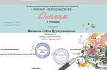 Сәнгать иҗаты өлкәсендә гомуми һәм өстәмә белем бирү өлкәсендә талантлы педагогларны ачыклау һәм аларга ярдәм итү максатында Яр Чаллы шәһәрендә педагоглар өчен «Минем дөньям – минем Илһамым» Бөтенроссия иҗади эшләр конкурсы узды. Конкурс ике категория буенча узды: "Новичок" һәм "Профи". " Профи" категориясендә Кукмара балалар сәнгать мәктәбенең сәнгать бүлеге укытучысы Низамова Ләйлә Нурмөхәммәт кызы 1 нче дәрәҗә диплом белән бүләкләнде. Җиңүчене котлыйбыз һәм алга таба һөнәри казанышлар телибез.