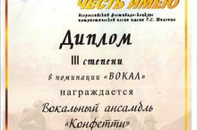 23 апреля в г. Вятские Поляны прошел Гала-концерт и церемония награждения по итогам Всероссийского фестиваля-конкурса патриотической песни имени Г.С.Шпагина.Вокальный ансамбль «Конфетти» Кукморской детской школы искусств, под руководством преподавателя Юзмеевой З.А. был удостоен звания Дипломанта 3 степени в номинации «Вокал».Поздравляем! -