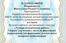 В апреле 2016 года состоялся Всероссийский дистанционный конкурс "Поверь в себя". В номинации "Лучшая методическая работа" преподаватель музыкального отделения Кукморской детской школы искусств Фатхуллина Разина Султановна заняла 1 место. Поздравляем!