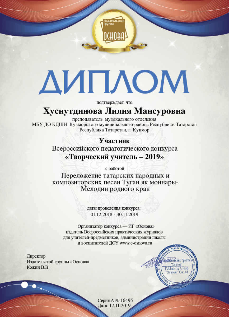 6. Низамова Лейля Нурмухаматовна- Участник Всероссийского педагогического конкурса "Творческий учитель 2019 " с работой "Народное искусство, как средство духовно- нравственного воспитания в учебной мастерской Art- Voilok"