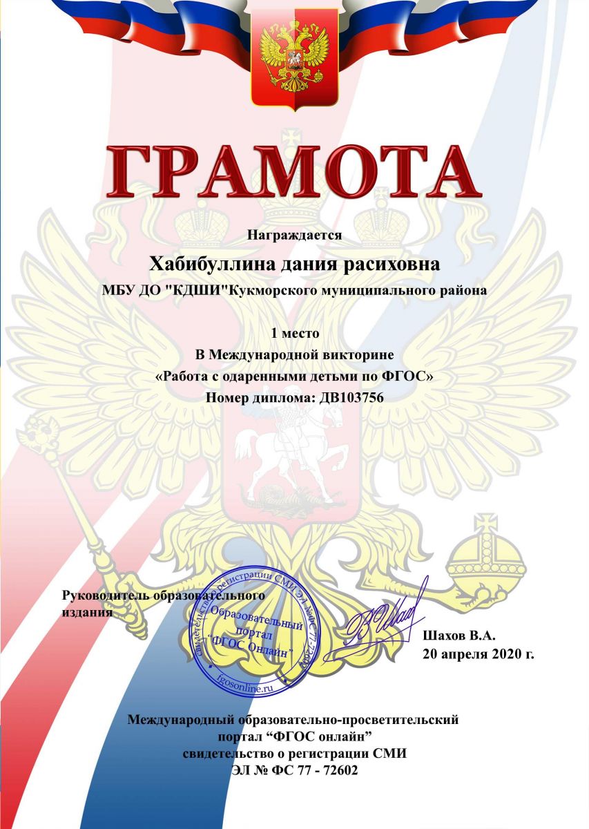 18. Хабибуллина Дания Расиховна- 1 место в Международной викторине "Работа с одаренными детьми"