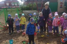 К малышам в детский сад пришел домовенок Кузя , чтобы отметить "День песка". С Кузей играли с песком, проверяли его свойства, лепили куличики, искали в песке клад.