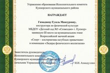 Подведены итоги муниицпального этапа Всероссийской заочной акции "Спорт - альтернатива пагубным привычка". Физинструкторы детского сада Гимадиева Г.М. и Фатхуллина Л.Р. заняли 3 место в номинации "Лидеры физического воспиания". Поздравляем!