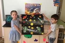 Ведь 12 апреля — день начала эпохи пилотируемых космических полетов — общий праздник, соединяющий прошлое, настоящее и будущее людей Земли. Поэтому этот день в детском саду был посвящен космосу: дети узнали много нового о космосе, летчиках, просмотрели презентации, фильмы о Белке и Стрелке, сотворили колаж "Космические приключения" и стали участниками развлечения "Быть космонавтом я хочу, скоро в космос полечу". -