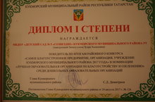 В рамках празднования Дня города были подведены итоги районного конкурса "Самое благоустроенное предприятие, организация, учреждение Кукморского муниципального района 2017 года". В номинации "Лучшая образовательная организация по благоустройству и озеленению" среди дошкольных образовательных организаций наш детский сад стал ПОБЕДИТЕЛЕМ и был награжден дипломом Кукморского муниципального района Республики Татарстан. Поздравляем!!!