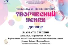 13 апреля 2024г. в г.Набережные Челны состоялся Международный конкурс-фестиваль "ТВОРЧЕСКИЙ УСПЕХ". Ансамбль скрипачей "Viva" (Гарифуллина Алсу, Мусина Зайнап, Петрова Влада, Федорова Алиана) под руководством Гумаровой Э.Г. и концертмейстера Мамкиной Д.Р. удостоились звания Лауреата 2 степени!! Молодцы!