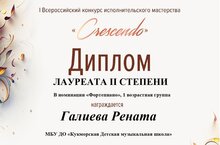 Стали известны результаты I Всероссийского конкурса исполнительского мастерства «Crescendo», прошедшего при поддержке Министерства культуры РТ в ГАПОУ «Казанский музыкальный колледж им.И.В.Аухадеева» . В номинации «Фортепиано» учащаяся фортепианного отделения Галиева Рената (преподаватель Шаймарданова З.К.) удостоилась звания Лауреата 2 степени!! Поздравляем!!!