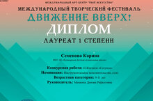 С.Петербург шәһәрендә үткән "Өскә хәрәкәт" Халыкара иҗат фестивале нәтиҗәләре билгеле булды. «Инструменталь башкару - соло» номинациясендә фортепиано бүлеге укучысы Семенова Карина (укытучысы Мамкина Д.Р.) 1 дәрәҗә Лауреат исеменә лаек булды! Киләчәктә уңышлар телибез!!!