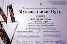 10 ноябрьдә Казанда узган “Музыкаль юл” Бөтенроссия күпжанрлы конкурсы нәтиҗәләре билгеле булды. «Концертмейстерское мастерство» номинациясендә фортепиано бүлеге укучысы Степанова Софья (укытучысы Бариева Д.М.) 3 дәрәҗә Лауреат булды! Котлыйбыз!!!