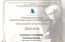 Поздравляем! Учащиеся фортепианного отделения нашей школы приняли участие IV Международном конкурсе татарской культуры, музыки и искусства им.Н.Г.Жиганова "НАСЛЕДИЕ ТАТАРСТАНА", прошедшего в г.Казань. В номинации "Инструментальное исполнительство ":