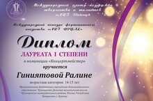 Санкт-Петербург шәһәрендә узган "Звездопад" халыкара фестиваль-конкурсы һәм "Мир талантов" халыкара сәнгать һәм иҗат фестивале нәтиҗәләре билгеле булды. Фортепиано бүлеге укучысы Гыйләҗева Айзирә (ук.Мамкина Д.Р.) ике конкурста да 2 дәрәҗә Лауреат исеменә лаек булды! Котлыйбыз!!! -