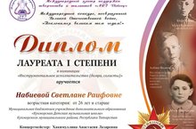 2022елның 21 апрелендә Мәскәү шәһәрендә Бөек Ватан сугышы "Поклонимя великим тем годам" дигән халыкара конкурс узды. "Надежда" инструменталь дуэты Нәбиева С.Р. һәм Хәкимуллина А.Л. инструменталь башкару (домра)" номинациясендә 1 нче дәрәҗә Лауреат исеменә лаек булдылар. Котлыйбыз!!! -