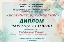 21 апреля в г. Москва состоялся Международный многожанровый конкурс-фестиваль «Весеннее вдохновение». Учащаяся 2 класса фортепианного отделения Шайдуллина Карима (преп.Шаймарданова З.К.) в номинации "Классическое инструментальное творчество" удостоилась звания Лауреата 1 степени! Поздравляем и желаем дальнейших творческих успехов!