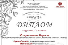 21 апрельдә Мәскәү шәһәрендә «Язгы илһам» Халыкара күпжанрлы конкурс-фестивале узды. "Классик инструменталь иҗат" номинациясендә фортепиано бүлеге укучысы Шәйдуллина Кәримә (ук.Шәймәрданова З.К.) "Классик инструменталь иҗат" номинациясендә 1 нче дәрәҗә Лауреат исеменә лаек булды! Котлыйбыз һәм алда иҗади уңышлар телибез! -