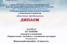 2 апреля 2022 г. в г.Казань состоялся VI Международный конкурс вокально-хорового и музыкального творчества "Весенние проталины" . В номинации "Хоровое пение. Ансамбль" вокальный ансамбль Кукморской детской музыкальной школы "Сандугач" стал Лауреатом 2-й степени (руководители Каримуллин Н.Р, Юзмеева З. А.). Поздравляем!!!