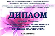 Стали известны результаты Республиканского фестиваля-конкурса по предмету общее фортепиано "Ступени мастерства", прошедшего в МБУ ДО ДШИ №6 Советского района г.Казани. Учащиеся отделения хорового пения Хаматдинова Ильдана (преп.Курочкина А.М.) удостоилась звания Лауреата 2 степени, Богабиева Амина (преп.Фасхутдинова Э.Х.) - Лауреата 2 степени! Поздравляем!!!