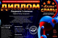 2022 елның 1 февраленнән 15 мартына кадәр Санкт-Петербург шәһәрендә РФ Мәдәният министрлыгы ярдәмендә "Дан аллеясы" Халыкара конкурс-фестивале уза. "Инструменталь башкару" номинациясендә укучы Хафизов Тимур (ук.Хәсәнова М.Р.) 1 дәрәҗә Лауреат исеменә лаек булды! Котлыйбыз! -