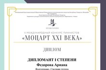 12-13 марта в г.Казань состоялся V Международный конкурс пианистов "Моцарт XXI века". Учредителем конкурса является региональный благотворительный общественный фонд развития музыкального исполнительства РТ "Sforzando". По итогам данного конкурса учащиеся фортепианного отделения класса преподавателя Фатхуллиной Р.С.Федорова Ариана - Дипломант 1 степени, Мусина Ляйсан - Дипломант 2 степени! Поздравляем!