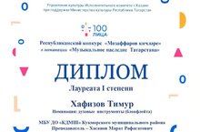 20 апреля в г.Казань состоялся конкурс "Мозаффаров кичлэре" в рамках проведения Республиканского конкурса детского творчества "100//лица" в номинации "Музыкальное наследие Татарстана". Учащийся отделения духовых и ударных инструментов Хафизов Тимур (преподаватель Хасанов М.Р.) удостоился звания Лауреата 1 степени! Поздравляем с победой!!!