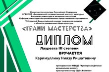 Преподаватель Кукморскойц детской музыкальной школы Каримуллин Н.Р. принял участие в V Всероссийском конкурсе творческих проектов в области праздничных форм культуры «Грани мастерства», организованного ФГБОУВО "Кемеровский государственный институт культуры". В номинации "PR-компания творческого проекта" он удостоился звания Лауреата 3 степени! Поздравляем и желаем творческих успехов!!!