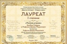 16 мая 2021 года в культурном центре "Сайдаш" г.Казани состоялся Международный фестиваль-конкурс татарского народного музыкального искусства «Дорогое наследие» - «Кадерле мирас». Ансамбль Учитель-ученик Бикбов Сайдаш и Рафиков Д.Ф. удостоился звания Лауреата 1 степени!!! Поздравляем!!!