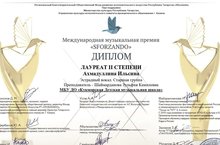 Стали известны результаты Международной музыкальной премии «SFORZANDO», которая состоялась 31 мая в г.Казань. Учащаяся нашей школы Ахмадуллина Ильсина (преподаватель Шаймарданова З.К.) удостоилась звания Лауреата 2 степени! Поздравляем!!!