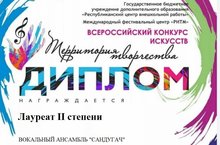 В марте 2021 года в г.Казань прошел Всероссийский конкурс искусств "Территория творчества", организованный фестивальным центром "РИТМ", ГБУДО "Республиканский центр внешкольный работы". В конкурсе принял участие ансамбль "Сандугач" (рук.Каримуллин Н.Р., Юзмеева З.А.) и удостоились звания Лауреата 2 степени. Поздравляем!!!