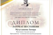 Стали известны результаты Всероссийского конкурса инструментального, вокального, хореографического, театрального и декоративно-прикладного искусства "МУЗЫКА ВЕЛИКОЙ СТРАНЫ". Учащаяся Мухутдинова Замира удостоилась звания Лауреата 3 степени. Поздравляем Замиру и преподавателя Семенову С.В. с победой!
