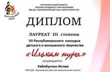 Васильевода узган “Илһам нуры” III республика балалар һәм яшүсмерләр иҗаты конкурсы нәтиҗәләре билгеле булды. «Тынлы уен кораллары, саксофон» номинациясендә тынлы уен кораллары бүлеге укучысы Хәбибуллин Ислам (укытучысы Хәсәнов М.Р.) өченче дәрәҗә Лауреат исеменә лаек булды! Киләчәктә дә иҗади уңышлар телибез! -