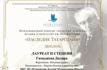 Гимадиева Диляра (преподаватель Ищенко К.А.) в номинации "Фортепиано" удостоилась звания Лауреата 2 степени!19 апрель көнне Казан шәһәрендә үткән "ТАРСТАНА ХАЛКЫ" халыкара татар мәдәнияте, музыка һәм сәнгать Н.Г.Җиһанов исемендәге конкурсы призерын котлыйбыз. Гыймадиева Диләрә (укытучысы Ищенко К.А.) "Фортепиано" номинациясендә 2 нче дәрәҗә Лауреат исеменә лаек булды!