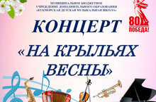 6 майда Кукмара балалар музыка мәктәбендә Пушкин картасы проектны гамәлгә ашыру кысаларында 3 нче мәктәпнең һәм С.А.Әхтәмов исемендәге урта мәктәп укучылары өчен "Яз канатларында" дигән концерт булды. Сәхнәдә музыка мәктәбен тәмамлаучылар чыгыш ясады, алар соңгы елларда үзләренең осталыгы югарылыгына ирешү өчен зур эш башкардылар. Тамашачылар төрле музыка коралларында: фортепиано, скрипка, баян һәм тынлы уен коралларында уйнадылар. Концерт программасына классик әсәрләр дә, заманча композицияләр дә керде. Концертны алып баручылар Бариева Д.М., Шәймәрданова З.К. -