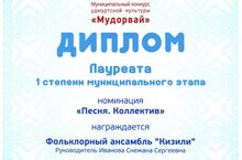 05 декабря 2022 года состоялся муниципальный конкурс удмуртской культуры «Мудорвай». Фольклорный ансамбль «Кизили» Центра детского творчества «Галактика» в номинации «Песня. Коллектив» удостоился Диплома 1 степени (руководитель педагог дополнительного образования – Иванова Снежана Сергеевна). 23 декабря 2022 года учащиеся выступят в республиканском этапе Конкурса. Поздравляем!