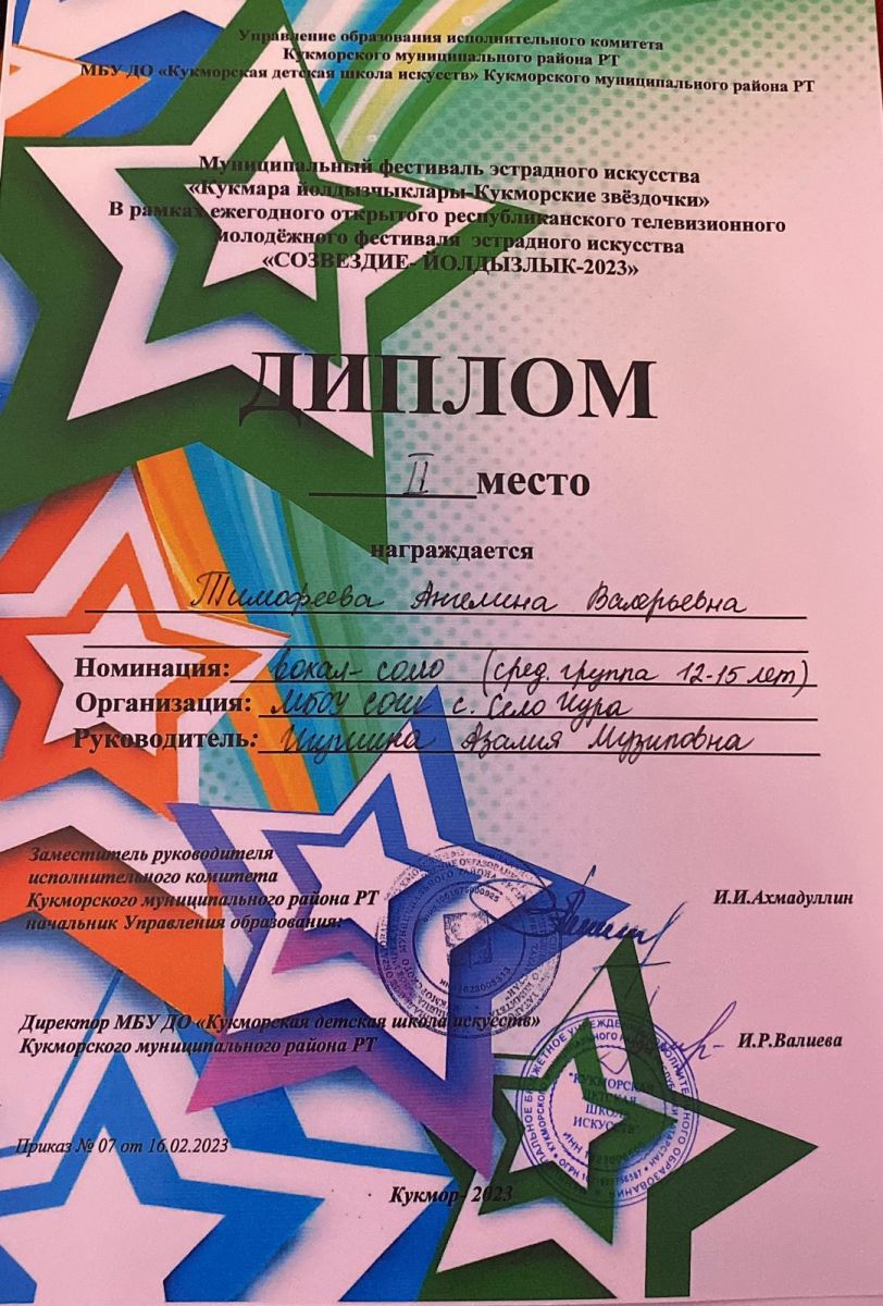 16 февраля воспитанники фольклорного коллектива "Тәңкәләр", а так же ученица 8 класса Тимофеева Ангелина приняли участие в муниципальном фестивале эстрадного искусства "Кукмара йолдызчыклары - Кукморские звездочки". Руководители: Григорьева Ю.В. и Игушина А.М./16 февральдә "Тәңкәләр" фольклор коллективында тәрбияләнүчеләр, шулай ук 8 сыйныф укучысы Тимофеева Ангелина "Кукмара йолдызлары - Кукморские звездочки"муниципаль эстрада сәнгате фестивалендә катнаштылар. Җитәкчеләре: Григорьева Ю. В. һәм Игушина А.М.
