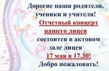 Дорогие наши родители,ученики и учителя!Отчетный концерт нашего лицеясостоится в актовом зале лицея17 мая в 17.30!Добро пожаловать! -