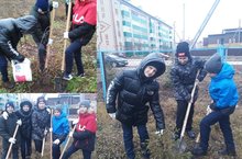 Экологическая акция "Посади дерево", участники акции учащиеся 6в класса (посадили 10 ёлок и 25 кустов смородины).