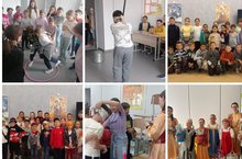 Праздник начался со сбора подарков, где наши девочки и девочки из 10го педагогического класса, переодетые в народные костюмы с песнями и танцами подходили к каждому отряду, поздравляли с праздником.